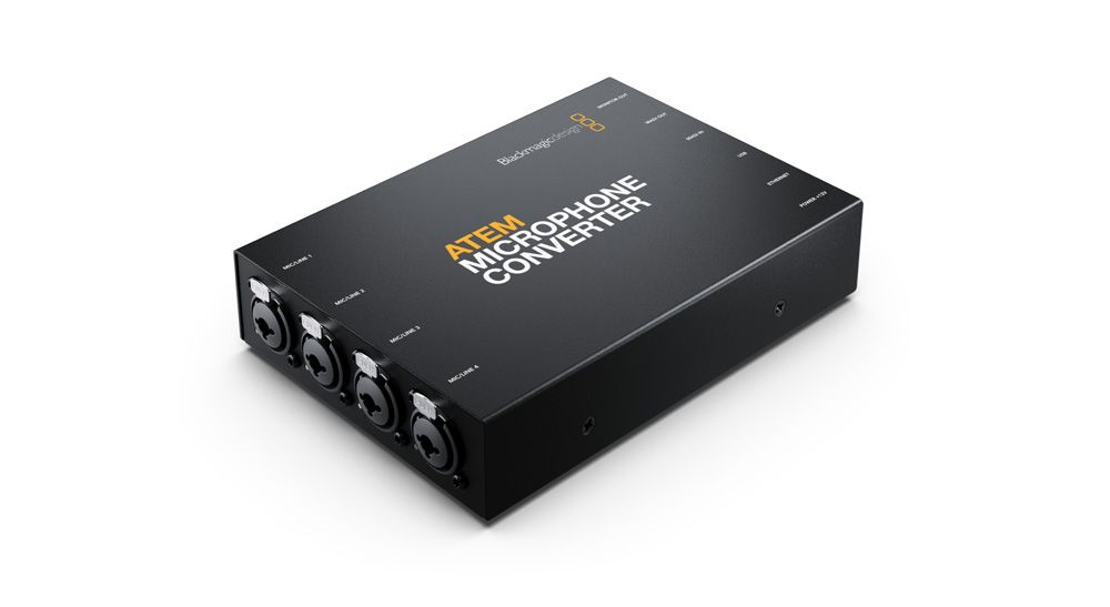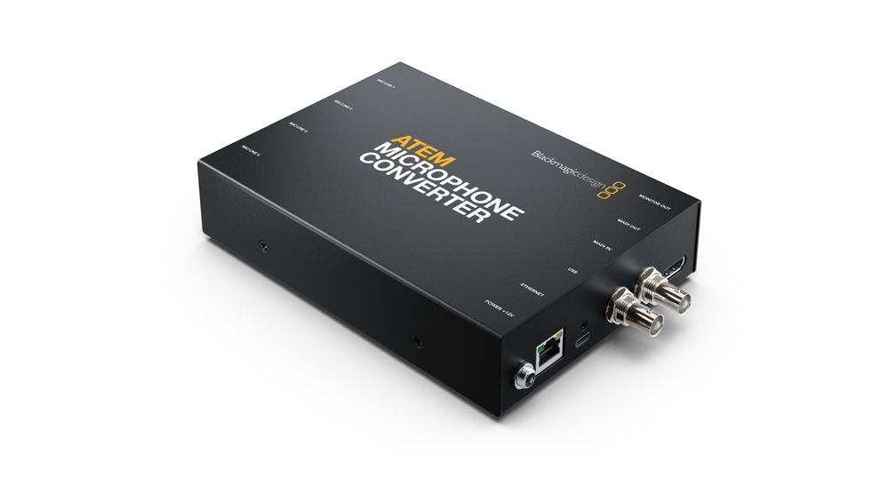 Теперь можно легко расширить вход MADI на коммутаторах ATEM, чтобы клиенты могли добавлять несколько микрофонов или внешних аудиомикшеров. ATEM Microphone Converter просто подключается к порту MADI ATEM Television Studio, поэтому не требуется сложной настройки, а дополнительные устройства можно даже последовательно подключить для большего количества источников. Каждый преобразователь имеет 4 аналоговых входа с фантомным питанием 48 В, которые можно выбирать между микрофонным и линейным входами. Дизайн отличается потрясающим качеством звука с чрезвычайно низким уровнем шума, широким динамическим диапазоном и очень низким уровнем искажений. В конструкции даже используется 8 отдельных АЦП на каждом отдельном входе, которые работают вместе для расширения динамического диапазона. Также имеется выход HDMI для мониторинга с прокруткой звуковых сигналов.